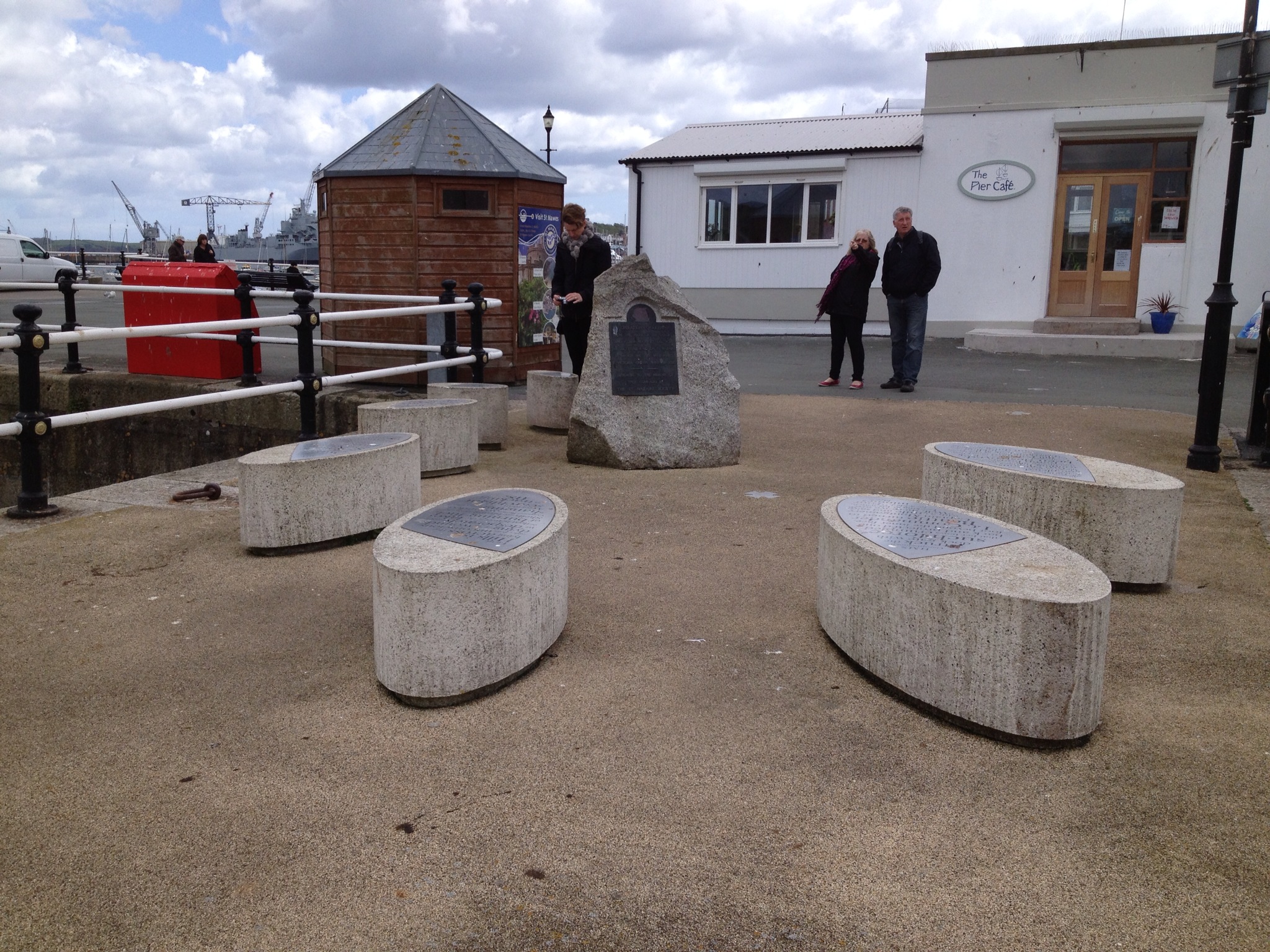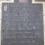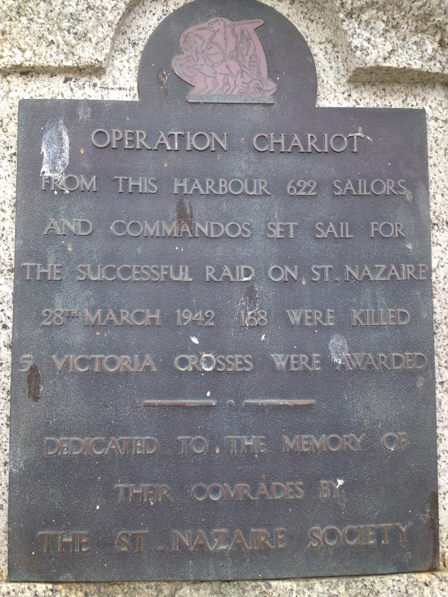 The original memorial was erected on Fish Strand Quay – the site where Campbeltown was moored and sailed for St Nazaire. In the ensuing years the area became a car park. It was here that ceremonies took place as it was a big enough venue to accommodate the many who wished to attend. In recent years this original memorial has been moved to be part of a larger memorial on the Prince of Wales Pier. It has been positioned so when viewing it is pointing in the direction of St Nazaire.